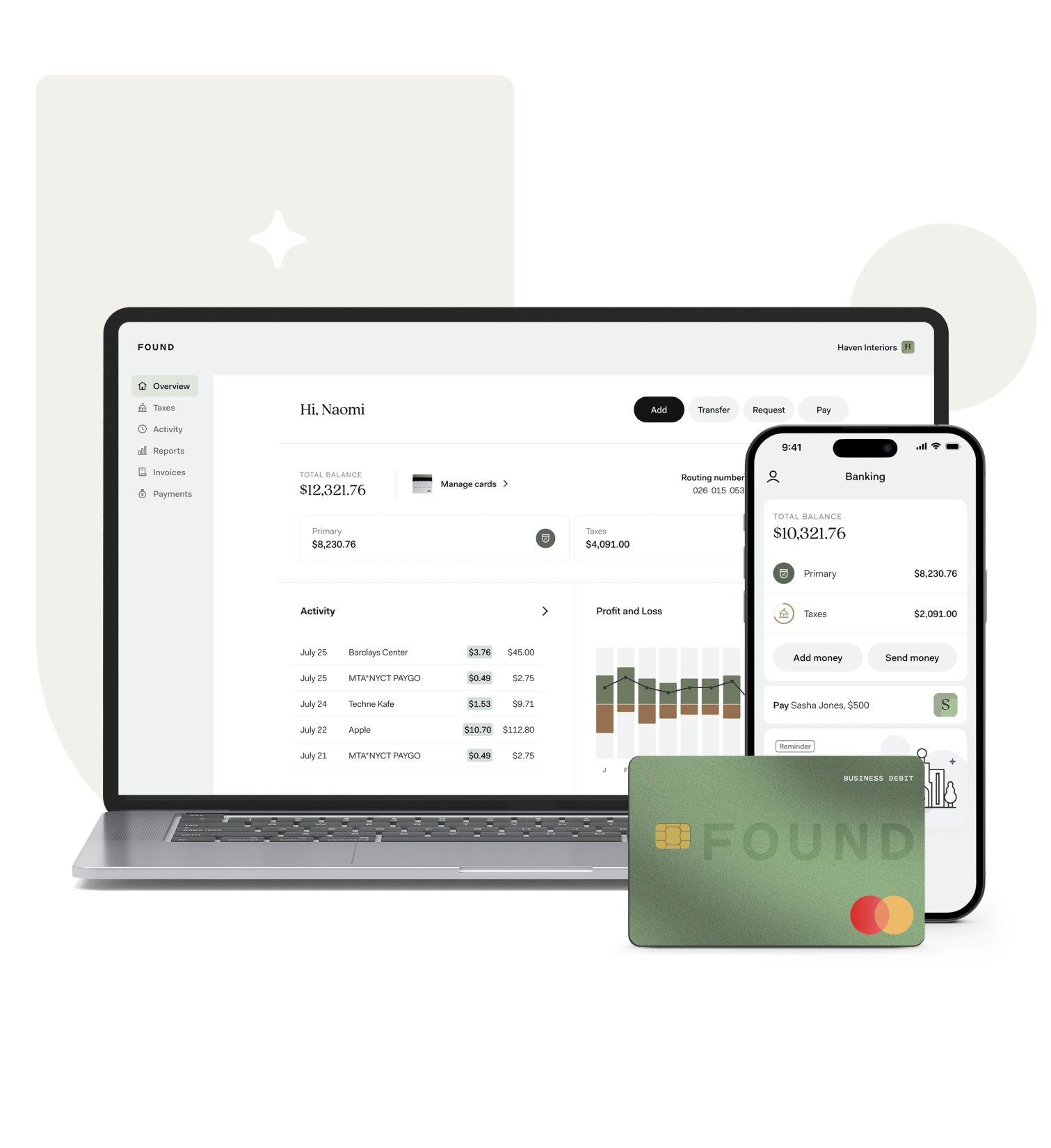 With a suite of robust tools, Found handles your finances—from banking to bookkeeping—all in one place. Manage your business from anywhere with through desktop login or Found's mobile app.Built-In Tax & Bookkeeping Tools